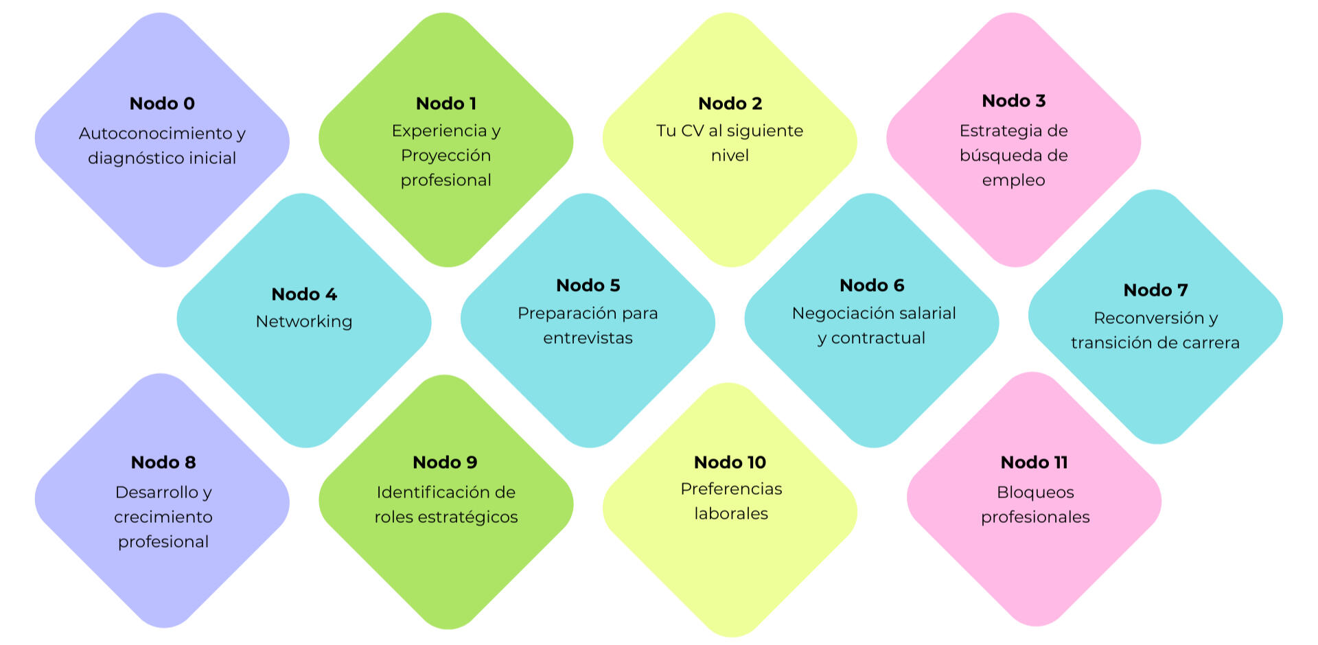 En este plan no es necesario elegir: trabajamos los 12 nodos porque creemos que todos impactan en tu empleabilidad. Es una visión integral, 360 de tu camino profesional.