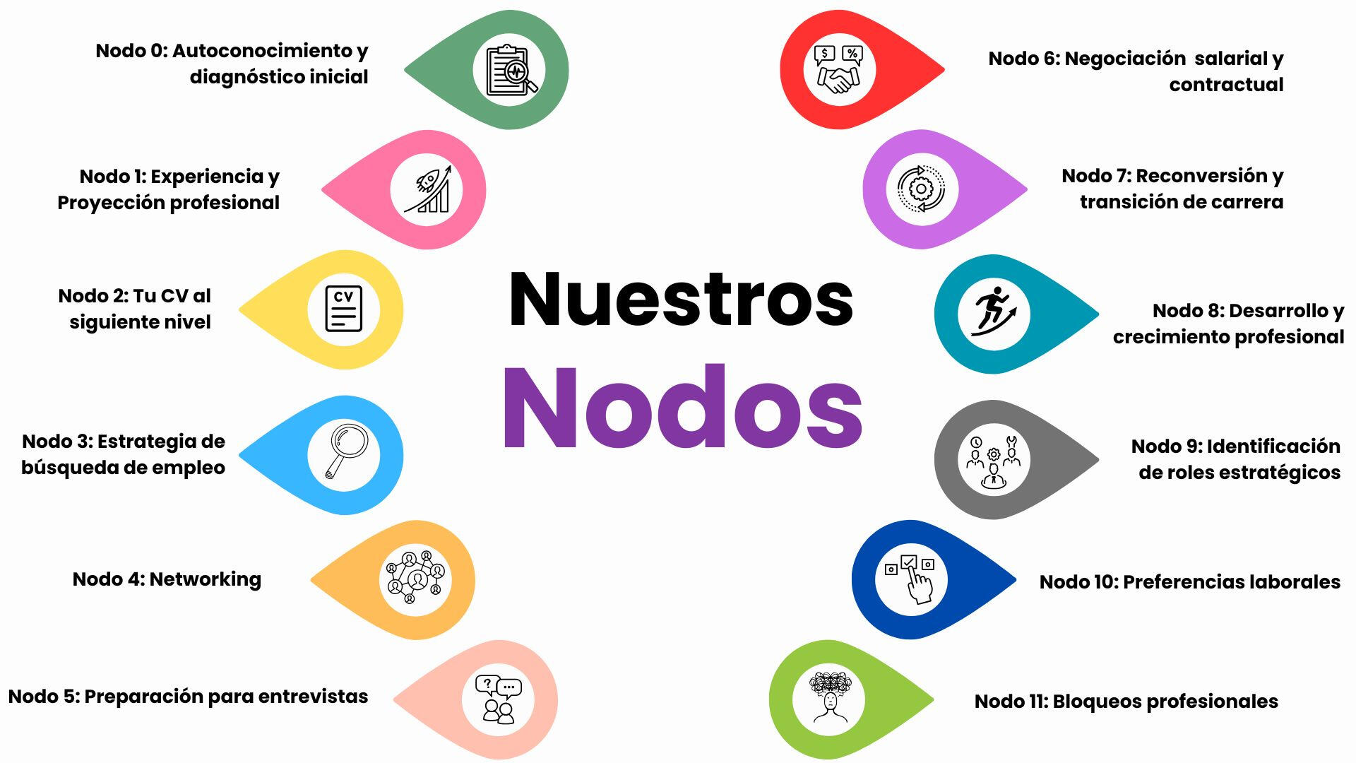 En este plan no es necesario elegir: trabajamos los 12 nodos porque creemos que todos impactan en tu empleabilidad. Es una visión integral de tu camino profesional.