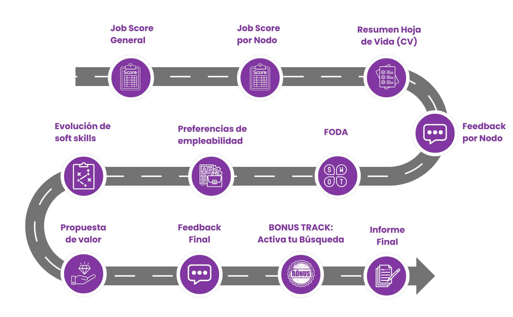 Feedback final: Una devolución empática, clara y honesta sobre cómo estás hoy en todos los aspectos de tu empleabilidad. Este feedback te muestra lo que estás haciendo bien, lo que deberías mejorar y por qué es importante trabajar en cada problema detectado.