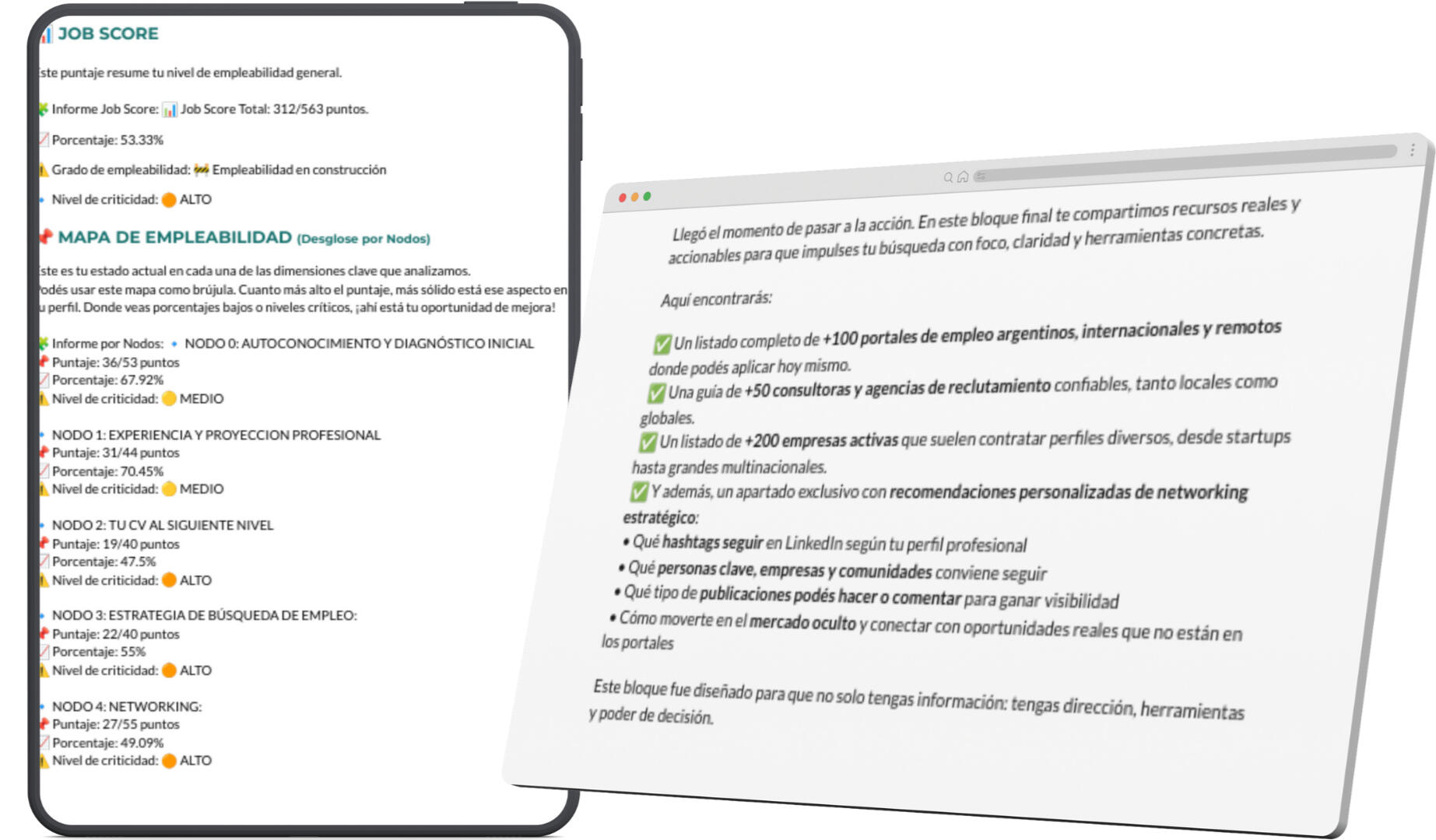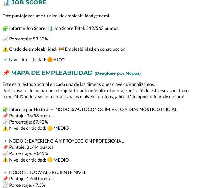 Jobs Score general: Es una puntuación integral que refleja tu nivel de empleabilidad actual. Analiza tus respuestas en todos los nodos y te muestra: Tu puntaje total (de 0 a 100), el porcentaje de evolución alcanzado tu nivel de criticidad (bajo, medio o alto) y tu grado de empleabilidad. Con esta métrica vas a poder medir con claridad dónde estás hoy y qué tan preparado/a estás para el mercado laboral.