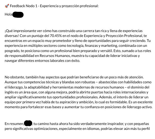 Feedback por Nodo: Cada nodo incluye un análisis personalizado generado por Kito, nuestra IA, que interpreta: tus respuestas, tu puntaje en ese nodo y el nivel de criticidad. Te brinda un feedback claro, empático y accionable para que entiendas qué aspectos tenés fortalecidos y cuáles necesitan evolución. Es como tener una devolución precisa en cada área clave de tu empleabilidad.